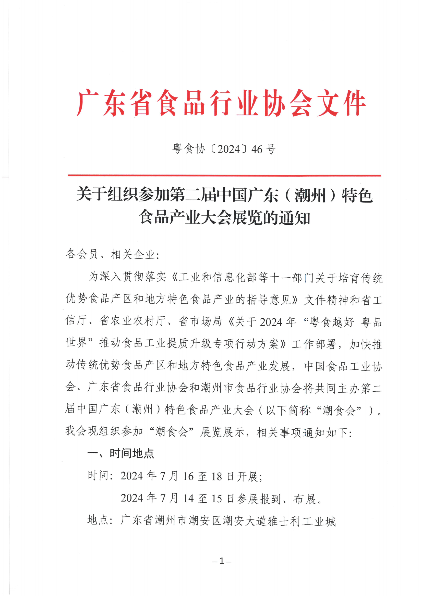 关于组织参加第二届中国广东(潮州)特色食品产业大会展览的通知
