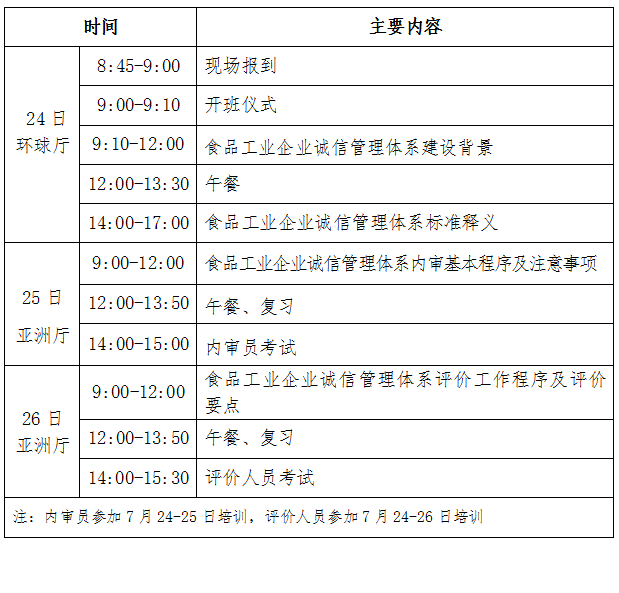 一、培训时间、地点 时间:2024年7月24-26日,诚信管理体系内审员培训2天;诚信管理体系评价人员培训3天(详见附件1)。