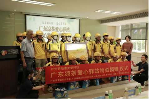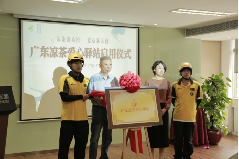 当天还进行了广东凉茶爱心驿站启用仪式和爱心物资捐赠仪式。由广东省凉茶博物馆馆长莫子瑜以及邓老金方董事长助理、客户管理中心总监徐凤仙共同为广东凉茶爱心驿站揭牌,并在现场向外卖小哥捐赠了装有上清饮、广东凉茶颗粒、夏桑菊颗粒、邓老凉茶的清凉消暑包。广东凉茶爱心驿站将持续为周边环卫工人、外卖小哥等户外劳动者提供休息场所及免费凉茶赠饮,传递社会关爱。