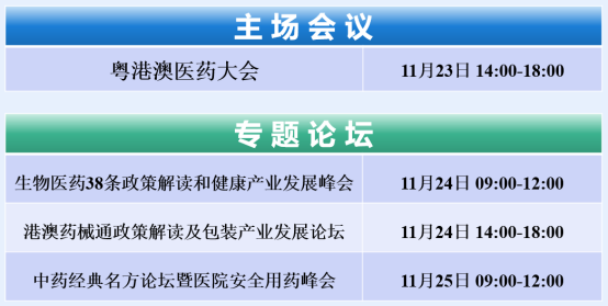 主场会议由中国工程院院士等专家剖析医药行业发展现状及生物医药研发趋势,展示分享科技创新成果与临床实践案例,业内精英将分享粤港澳医药行业融合发展经验。