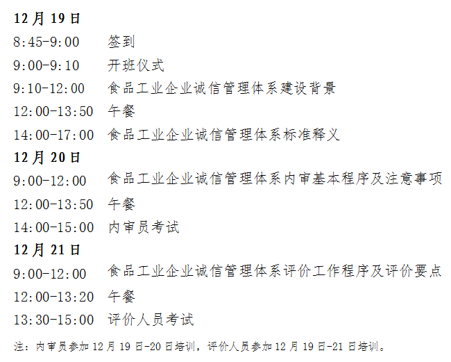 一、培训时间、地点 时间:2024年12月19日-21日,诚信管理体系内审员培训2天;诚信管理体系评价人员培训3天(详见附件1)。