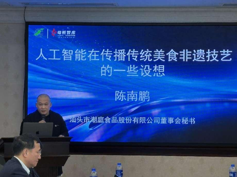 潮庭食品陈南鹏介绍了公司与汕头大学合作开发手打牛肉丸机器人的经验,并分享了运用AI技术传播非遗文化的思路以及在企业营销与合规风控的应用。