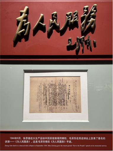 图为毛泽东同志纪念馆内展出的毛泽东修改《为人民服务》的手迹