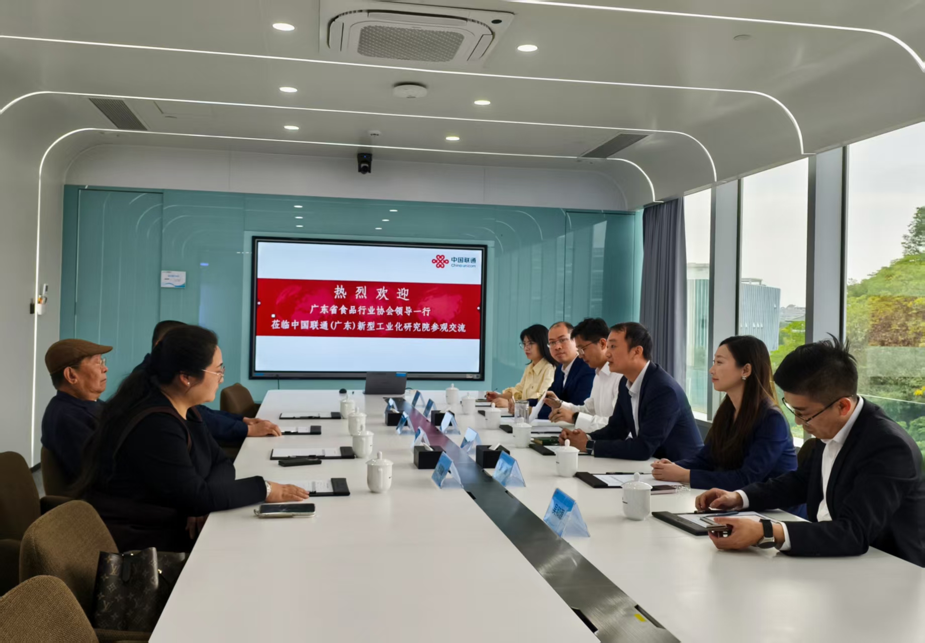 11月18日,广东省食品行业协会创会会长张俊修,广东省食品医药行业联合党委书记曾祥云等一行应邀到副会长单位中国联通(广东)新型工业化研究院,参观并座谈交流。双方围绕食品行业数字化转型、创新技术应用等议题展开深入探讨,共话产业高质量发展。