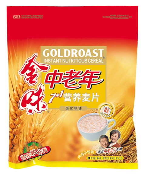 金味中老年7+1营养麦片(强化钙铁),产品经冲调后味道浓郁,奶香自然,麦香味浓,强化钙、铁、锌、卵磷脂、及多种维生素,满足特殊人群的需求。
