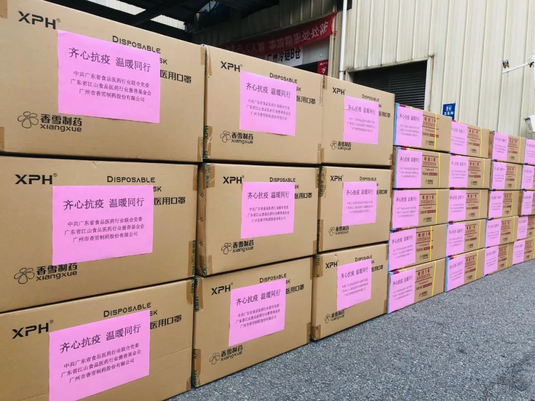 中共广东省食品医药行业联合党委、广东省江山食品医药行业慈善基金会、香雪制药联合捐赠一批价值10万余元的粤抗1号凉茶固体饮料、一次性使用医用口罩物资