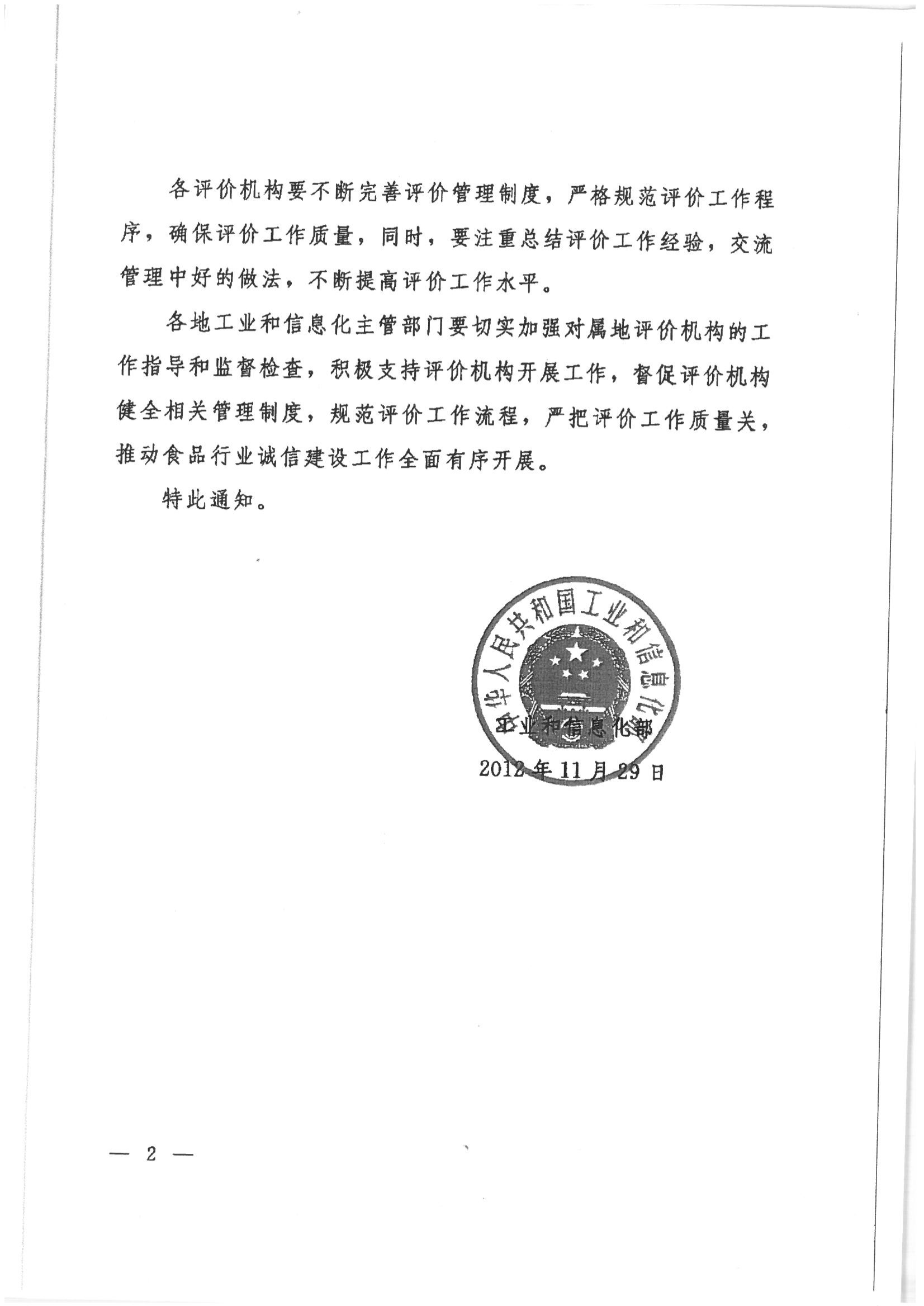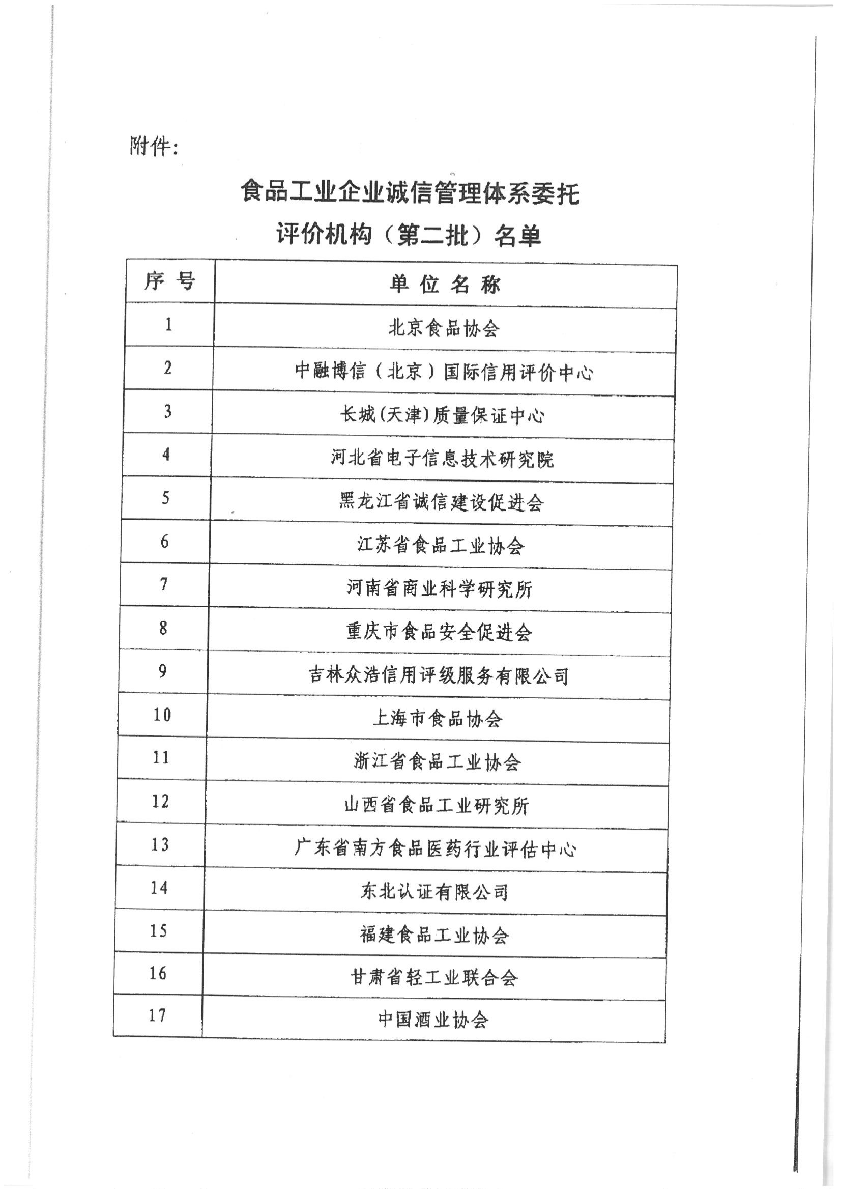 工信和信息化部关于印发食品工业企业诚信管理体系委托评价机构(第二批)名单的通知