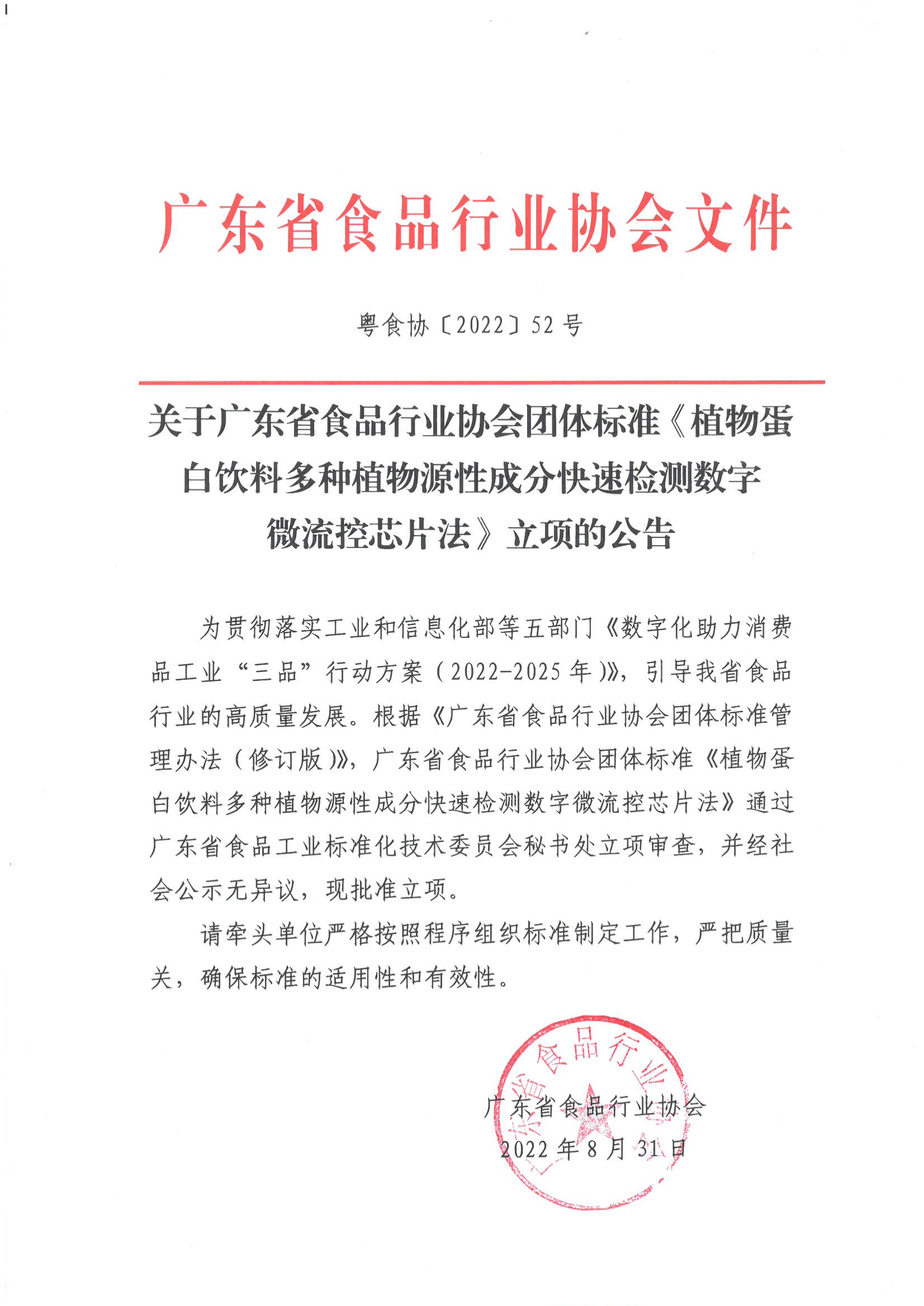 关于广东省食品行业协会团体标准《植物蛋白饮料多种植物源性成分快速检测数字微流控芯片法》立项的公告