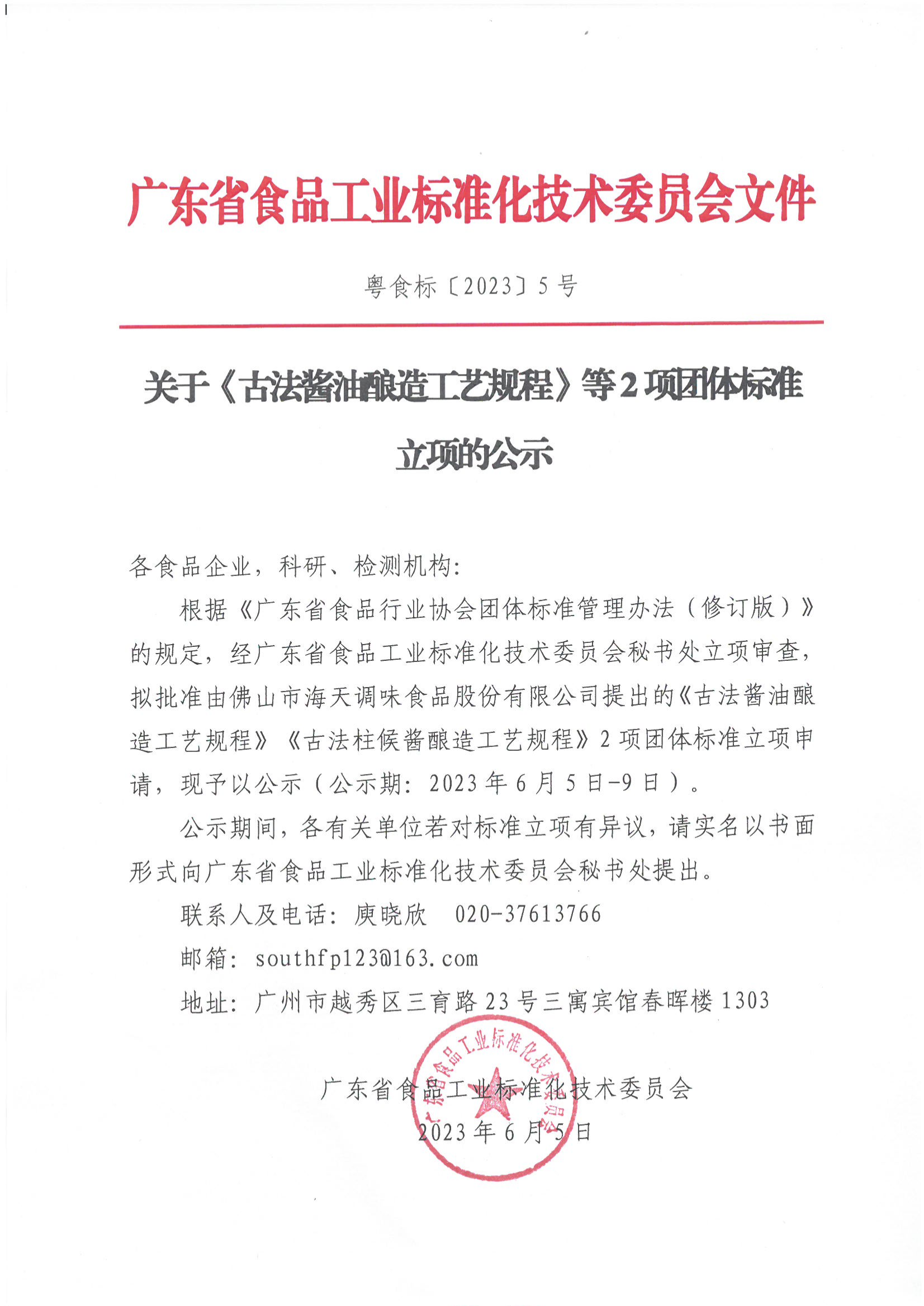 关于《古法酱油酿造工艺规程》等2项团体标准立项的公示
