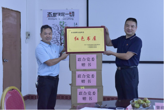 为贯彻落实习近平总书记“把红色资源利用好,把红色传统发扬好,把红色基因传承好”重要指示精神,联合党委在凉茶分会党支部设立“红色书屋”。联合党委书记曾祥云同志代表联合党委向凉茶分会党支部赠送了一批红色主题书刊,并授予凉茶分会党支部“红色书屋”牌匾。