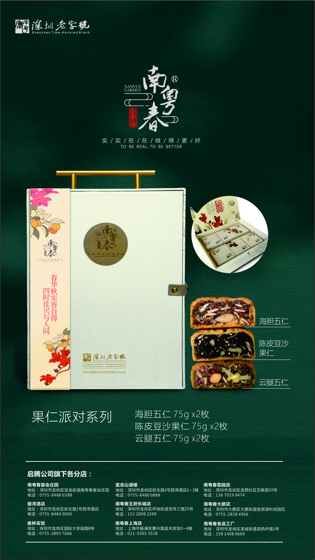 启腾南粤春旗下明星产品果仁派对中秋月饼,由海胆五仁月饼、陈皮豆沙月饼、云腿五仁月饼组成,其中重要的一款海胆五仁月饼特别甄选了来自深圳大鹏湾海域的特产——紫海胆作为主要原料。月饼制作工艺上采用手工开皮、手工包制的方式,做到每个月饼馅料均匀,饼皮厚薄均匀;烤好的月饼,经过回油,外表色泽发亮,切开果仁粒粒饱满,口感滑软,海胆味浓郁。具有配料考究、皮薄馅多、味美可口、不易破碎、便于携带等特点。